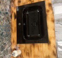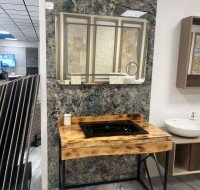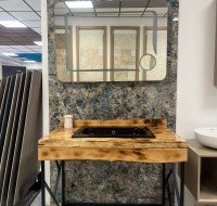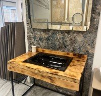 Meuble de salle de bain plateau en bois massif et vernis vasque noir en céramique miroir led