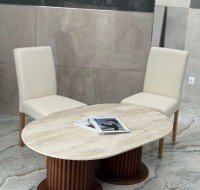 table basse en travertin modèle zak 1 plateau en travertin poli rebouché avec 2 pieds en bois